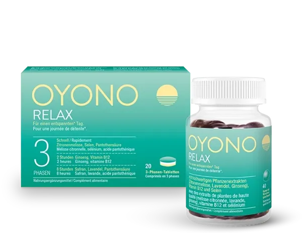 Das innovative OYONO RELAX Produktkonzept umfasst eine 3-Phasen-Tablette und schmackhafte Gums mit wertvollen Pflanzenextrakten, Vitaminen und Spurenelementen. Die Produkte können in Kombination eingenommen werden: Eine Tablette und bis zu drei Gums am Tag. Die 3-Phasen-Tablette gibt die Inhaltsstoffe zeitlich versetzt über den Tag hinweg frei, während bei den Gums die Freigabe aller Inhaltsstoffe schnell nach der Einnahme erfolgt.