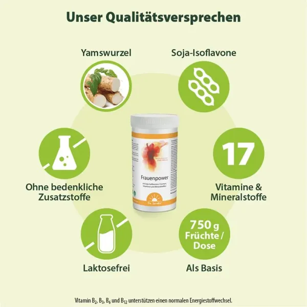 Frauenpower ist ein köstliches Getränkepulver mit Früchten, Yamswurzel-Pulver, Magnesium, organisch gebundenen Spurenelementen und Soja-Isoflavon-Extrakt (50 mg Phytoöstrogene je Portion).