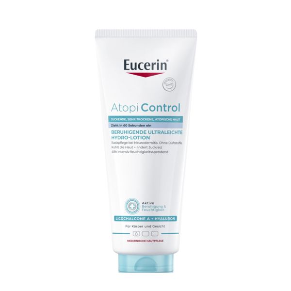 Die Eucerin® AtopiControl beruhigende Hydro-Lotion ist eine parfümfreie, täglich anzuwendende Basispflege, die den Juckreiz* sofort lindert, 48h Feuchtigkeit spendet und die Hautbarriere regeneriert. Die ultraleichte Formel zieht in 60 Sekunden ein und kühlt die Haut.