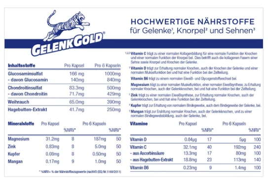Glucosaminsulfat Kalium (enthält Krebstiere), Hydroxypropylmethycellulose als Bestandteil der Kapselhülle, Chondroitinsulfat Natrium, Weihrauchpulver, Magnesiumoxid, Hagebutten-Extrakt, Füllstoff (Mikrokristalline Cellulose, Cellulose, Carboxymethylcellulose), L-Ascorbinsäure, Trennmittel (Siliciumdioxid, Magnesiumsalze von Speisefettsäuren), Zinkoxid, Mangansulfat, Pyridoxinhydrochlorid, Kupfercitrat, Cholecalciferol