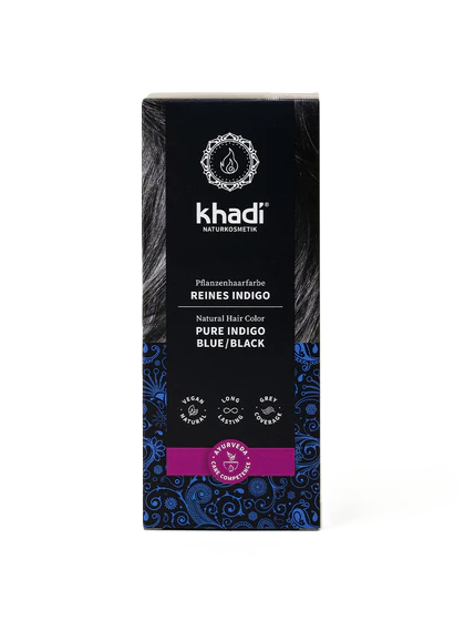 Die Naturhaarfarbe ist rein pflanzlich und vegan. Denn khadi Indigo besteht zu 100 % aus reinem Indigo. Das sorgt für ein tiefes Schwarz und deckt sämtliche Ausgangsfarben ab. Allerdings benötigst Du für mittelblondes oder helleres Haar sowie für graues und weißes Haar eine Vorbehandlung mit Khadi Reines Henna.