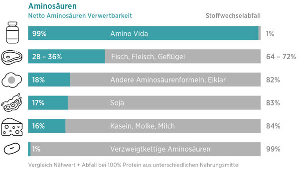 - Amino Vida bildet nur 1 % Stickstoffabfall. Das ist im Vergleich mit anderen Proteinquellen ein sehr tiefer Wert.