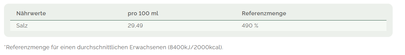 Unsere Ur-Salz Sole kann nicht pur eingenommen werden, sondern muss immer verdünnt werden. Wird sie so wie in der angegebenen Verzehrempfehlung mit Wasser verdünnt, schmeckt das fertige Getränk ganz leicht salzig, ohne weitere Geschmacksstoffe.