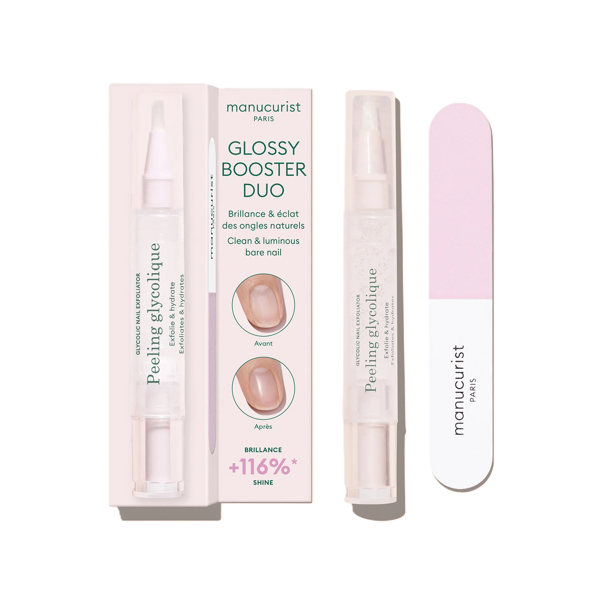 Ideal für matte Nägel, kombiniert der Glossy Booster Duo die exfolierende Wirkung des Glykolsäure-Peelings mit der glättenden Wirkung des Polierblocks, um in nur wenigen Sekunden glänzende und strahlende Nägel zu erzielen. Inspiriert von der japanischen Maniküre.