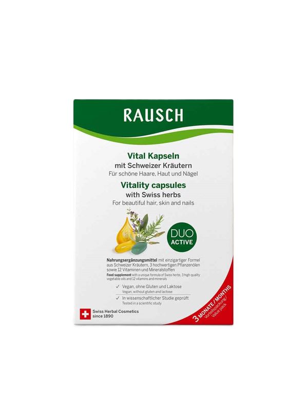 Die RAUSCH SCHWEIZER KRÄUTER VITAL KAPSELN mit einer einzigartigen Wirkstoffkombination aus 3 hochwertigen Pflanzenölen, 8 vitalisierenden Kräuter-Extrakten und 12 Vitaminen und Mineralstoffen für kräftiges, fülliges Haar, geschmeidige, straffe Haut, gesunde, starke Nägel und Wohlbefinden.