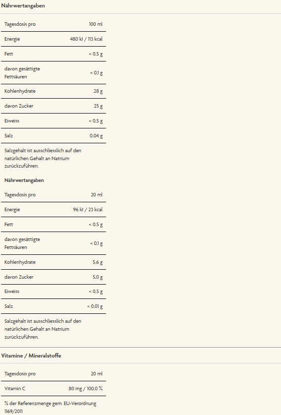 Bereits die Tagesmenge von 20 ml versorgt den Körper mit 80 mg Vitamin C aus der Bio-Acerolakirsche und deckt somit die empfohlene tägliche Zufuhr von Vitamin C zu 100 % ab.