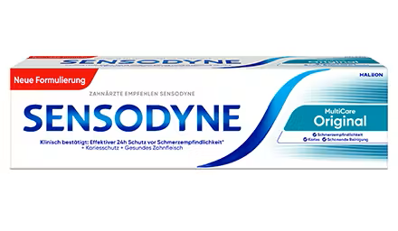 Beim täglichen Zähneputzen mit Sensodyne MultiCare Original legt sich der Wirkstoff Kaliumnitrat schützend um den Zahnnerv, wirkt beruhigend und bekämpft so den Schmerz. Zusätzlich wird die Plaque-Neubildung reduziert und durch den Zinkzusatz Zahnfleischproblemen vorgebeugt.