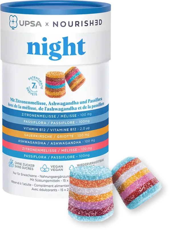 Die 7-in-1-NIGHT-Gummies sind der perfekte Abendbegleiter mit Ashwagandha, Passionsblume und Melisse. Ideal für Abendroutinen – vegan, zuckerfrei, glutenfrei und fruchtig.