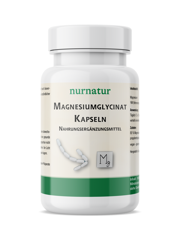 Unsere reinen Magnesiumglycinat Kapseln sind hoch bioverfügbar und besonders gut verträglich – ideal bei empfindlicher Verdauung. Magnesium trägt bei zur: