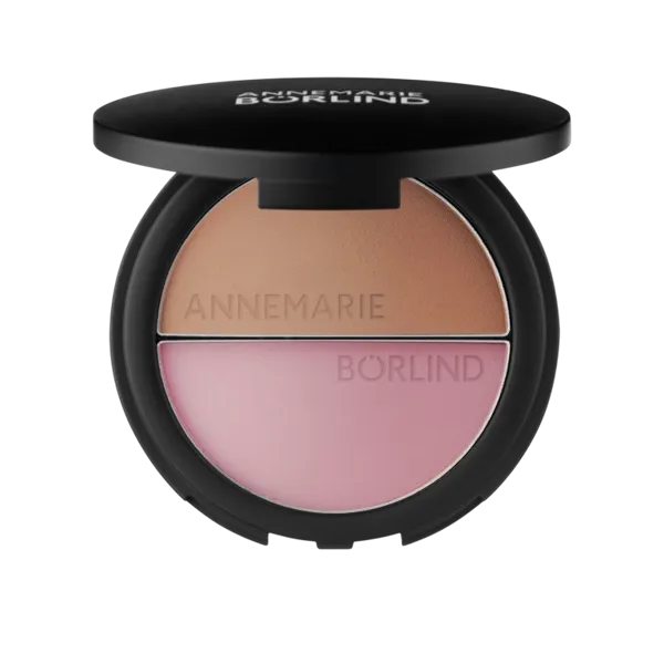 Für einen natürlichen Look die beiden Puder mit dem Pinsel aufnehmen, mischen und auf die Wangenpartie, Stirn und Kinn auftragen. Für einen definierten Look nimm erst den BRONZER mit dem Pinsel auf und trage ihn unterhalb Deiner Wangenknochen, auf der Stirn, entlang der Nasenkontur und am Kinn auf. Verwende anschliessend das ROUGE auf der Wangenpartie.
