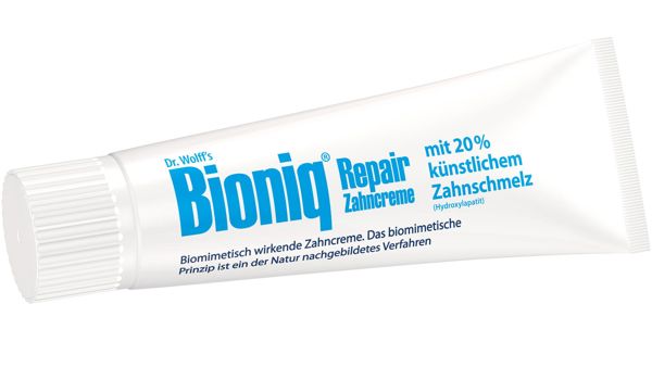 Von der Natur lernen und das Wissen in innovative Produkte umsetzen: Die Bioniq® Repair-Zahncreme basiert auf dieser?Idee der Bionik/Biomimetik. Sie enthält Hydroxylapatit – eine Substanz, die dem menschlichen Zahnschmelz nachempfunden ist. Dieser Wirkstoff in der Bioniq® Repair-Zahncreme hilft, den Zahnschmelzabtrag zu minimieren und sowohl Zähne als auch Zahnfleisch langfristig gesund zu halten.