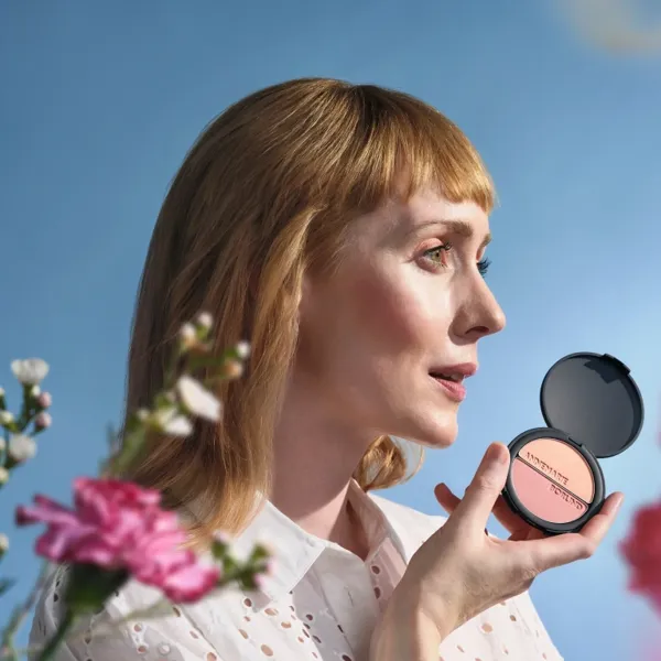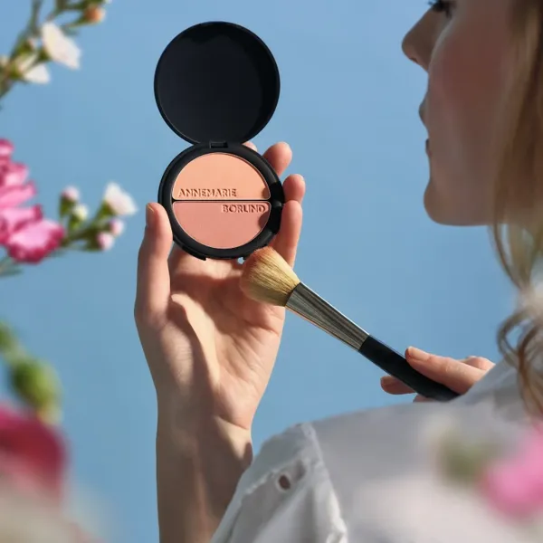 Für einen natürlichen Look die beiden Puder mit dem Pinsel aufnehmen, mischen und auf die Wangenpartie und Stirn auftragen, die helle Farbe auf die Augenlider auftragen.