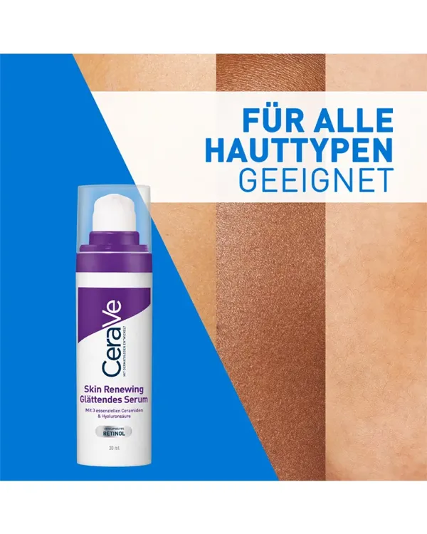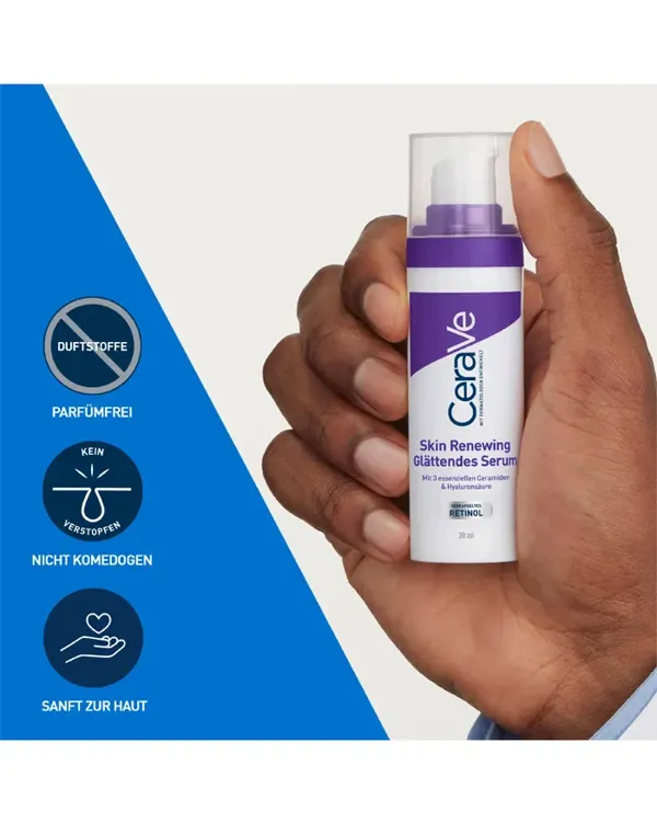 CeraVe Skin Renewing Glättendes Serum wird als Teil der Abendroutine nach der Gesichtsreinigung aufgetragen. Das Gesichtsserum in kleinen Punkten auf dem Gesicht verteilen und sanft in die Haut einmassieren, bis es eingezogen ist. Nach der Anwendung jedes Retinol-Produkts sollte tagsüber zusätzlich ein Sonnenschutz oder eine Gesichtscreme mit LSF aufgetragen werden. Bei Irritationen das Produkt abwaschen und die Anwendung pausieren oder erst eine Feuchtigkeitspflege als Puffer auftragen.