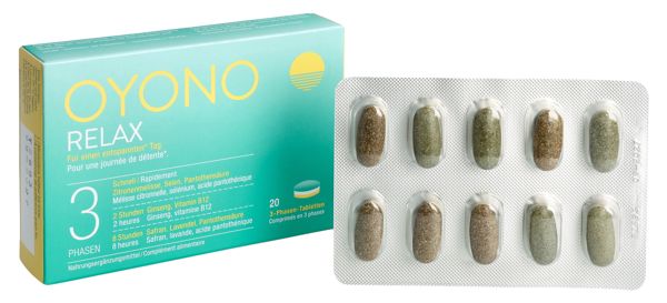 Das innovative OYONO RELAX Produktkonzept umfasst eine 3-Phasen-Tablette und schmackhafte Gums mit wertvollen Pflanzenextrakten, Vitaminen und Spurenelementen. Die Produkte können in Kombination eingenommen werden: Eine Tablette und bis zu drei Gums am Tag. Die 3-Phasen-Tablette gibt die Inhaltsstoffe zeitlich versetzt über den Tag hinweg frei, während bei den Gums die Freigabe aller Inhaltsstoffe schnell nach der Einnahme erfolgt.