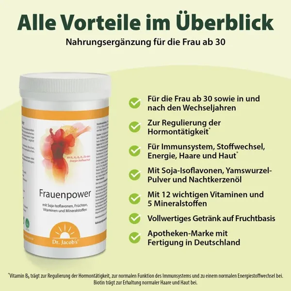 Dr. Jacob‘s Frauenpower für normale Hormone1, Energie2, Stoffwechsel2, Immunsystem3, Haare und Haut4