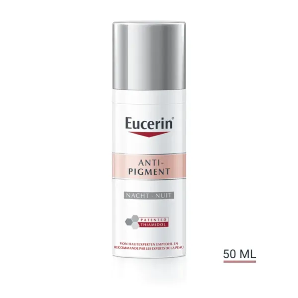 Die Eucerin® Anti-Pigment Nachtpflege enthält den effektiven und patentierten Pflegewirkstoff Thiamidol®. Dieser wirkt von Tag 1 an auf die Melaninproduktion an ihrem Ursprung ein und lässt Pigmentflecken nach und nach verblassen. Bereits nach zwei Wochen sind erste Ergebnisse sichtbar, welche sich bei regelmässiger Anwendung deutlich verbessern. Wissenschaftliche Tests belegen, dass Pigmentflecken aller Art reduziert und ihrer Neuentstehung vorgebeugt wird.