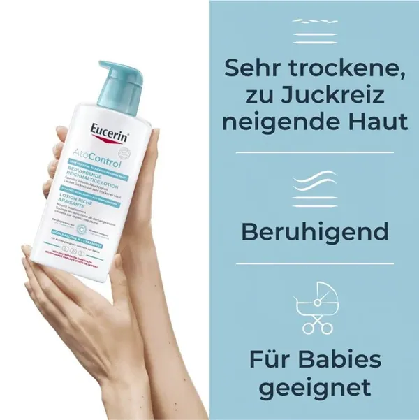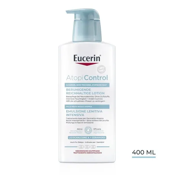 Eucerin® AtopiControl beruhigende, reichhaltige Lotion ist eine Lotion für den täglichen Gebrauch, die speziell dafür entwickelt wurde, gereizte und zu Juckreiz neigende Haut zu beruhigen und intensiv mit Feuchtigkeit zu versorgen. Diese schnell einziehende Wasser-in-Öl-Lotion ist mit beruhigendem Licochalcone A, Ceramiden und Omega-Ölen angereichert, um die Hautbarriere zu stärken und Trockenheit und Juckreiz zu lindern*. Bei regelmässiger Anwendung verbessert sich der Hautzustand spürbar und die Haut wird weicher und glatter.