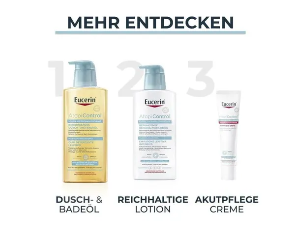 Tragen Sie AtopiControl Beruhigende Reichhaltige Lotion so oft wie nötig auf. Für beste Ergebnisse in Kombination mit Eucerin AtopiControl Beruhigendes Dusch- und Badeöl verwenden.