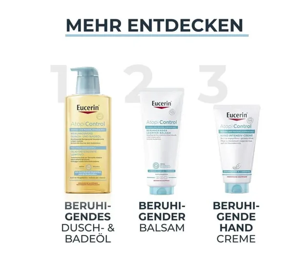 Eucerin® AtoControl beruhigende Handcreme glättet und beruhigt sehr trockene Hände. Die schnell einziehende und nicht fettende Formel enthält einen einzigartigen Wirkstoffkomplex aus beruhigendem Licochalcone A, antibakteriellem Decandiol und juckreizlinderndem Methoxypropandiol (MPD). Dieser Komplex, kombiniert mit einer hohen Konzentration an Ceramiden und Avena Sativa (Haferflocken), wirkt als starker Feuchtigkeitsspender, stärkt die Hautbarriere, lindert Trockenheit und lindert das Juckreizgefühl.