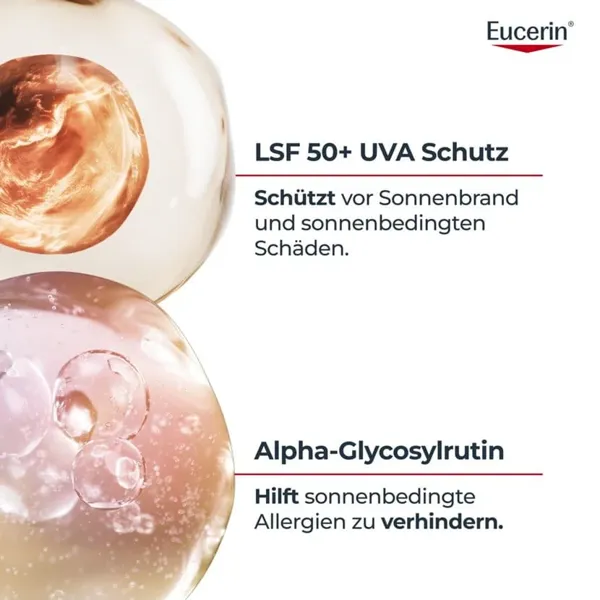 Der Sonnenschutz bei Sonnenallergie bietet einen sehr hohen UV-Schutz. Die Advanced Spectral Technology von Eucerin kombiniert diese breitbandigen und photostabilen UVA/UVB-Filter mit Licochalcone A, das freie Radikale neutralisiert, die durch UV- und HEVIS-Licht entstehen. Zusätzlich enthält die Formulierung Alpha-Glycosylrutin, das hilft, sonnenbedingten Hautreaktionen wie PLE (Polymorphen Lichtdermatose) vorzubeugen.