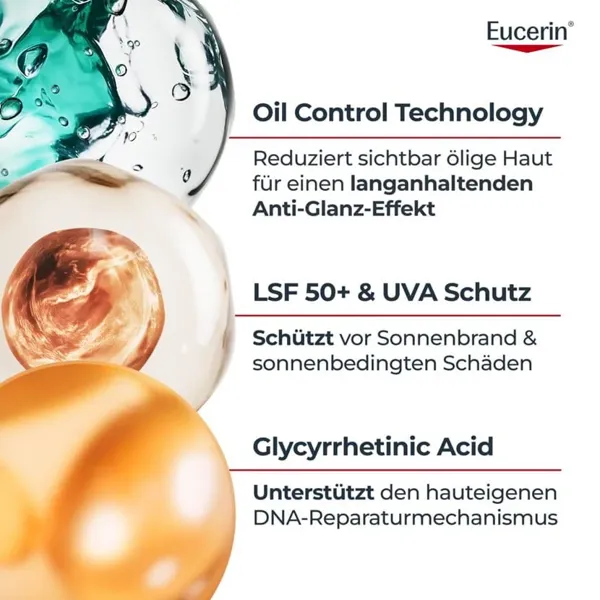 Die Advanced Spectral Technology kombiniert UVA/UVB-Filter¹ für hohen UV-Schutz und Licochalcone A zur Neutralisation freier Radikale, ausgelöst durch UV- und hochenergetisches sichtbares Licht. Die Sonnencreme enthält ebenso Glycyrrhetinsäure, welche die hauteigene DNA-Reparatur unterstützt, und die Oil Control Technology mit mattierenden Pigmenten, die einen sofortigen und langanhaltenden Anti-Glanz Effekt hinterlassen.
