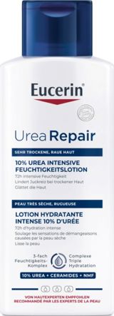 Die UreaRepair 10% Urea intensive Feuchtigkeitslotion mit dreifach Feuchtigskomplex zur sofortigen Linderung von rauen, sehr trockenen Hauterscheinungen: Rauheit, Rötung, Schuppigkeit, Juckreiz und Spannungsgefühl. 72 Stunden intensive Feuchtigkeit und Stärkung der Schutzbarriere.