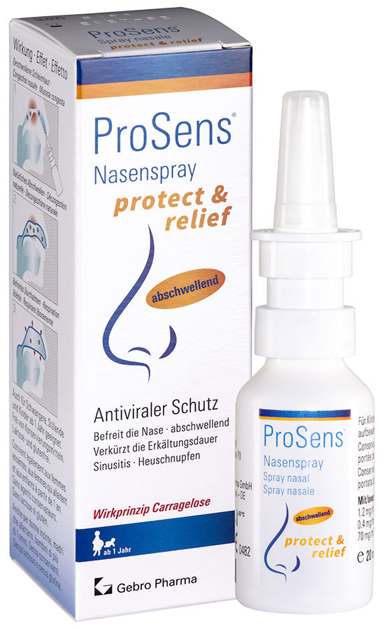 ProSens® Nasenspray protect + relief ist eine klare, farblose, viskose Lösung ohne Geruch. 1 ml Lösung enthält 1.2 mg Iota- Carrageen ( ), 0.4 mg Kappa-Carrageen, 70 mg Sorbitol (entsprechend 2.3 % Salzlösung), Natriumchlorid, Ethylendiamintetraessigsäure, Puffer und gereinigtes Wasser. Carragelose® ist ein mariner Wirkstoff, der aus Rotalgen gewonnen wird. Carragelose® wurde in vitro und in mehreren klinischen Studien erfolgreich getestet.