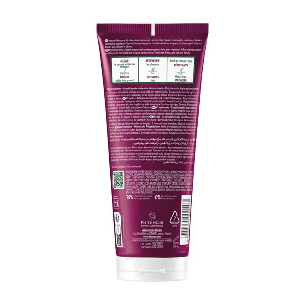 Wächst Ihr Haar langsam? Träumen Sie von längerem und kräftigerem Haar? Der Haarwuchs-Pflegebalsam, angereichert mit medizinischem Chinin, wirkt auf die Kopfhaut und die Haarlängen, um die Haardichte zu stimulieren. Sie fördert das Haarwachstum, reduziert Haarbruch bereits nach der ersten Anwendung und verbessert die Haarqualität, sodass sich das Haar leichter stylen lässt. Das Ergebnis: kräftigeres, dickeres und glänzenderes Haar, das dichter wirkt. Perfekt, um das Haarwachstum anzuregen und wieder volles, vitales Haar zu erhalten.
