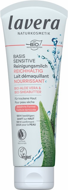 Die basis sensitive reichhaltige Reinigungsmilch reinigt und pflegt nachweislich sanft mit feuchtigkeitsspendender Bio-Aloe Vera und Bio-Sheabutter mit Vitamin E