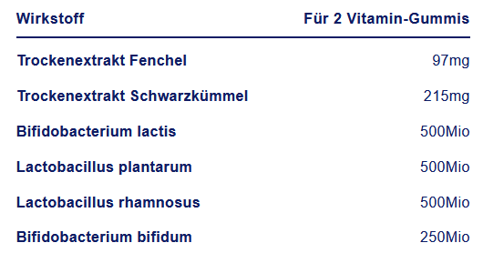Füllstoff: Maltit – Schwarzkümmel-Trockenextrakt (Carum carvi L.) – Fenchelfrucht-Trockenextrakt (Foeniculum vulgare) - Geliermittel: Pektin - Säuerungsmittel: Zitronensäure, Natriumcitrat - natürliche Aromen - Konzentrat (Färberdistel und Zitrone) - Überzugsmittel: Carnaubawachs - inaktiviertes Bifidobacterium bifidum - inaktiviertes Lactobacillus plantarum – inaktiviertes Lactobacillus rhamnosus, inaktiviertes Bifidobacterium lactis.