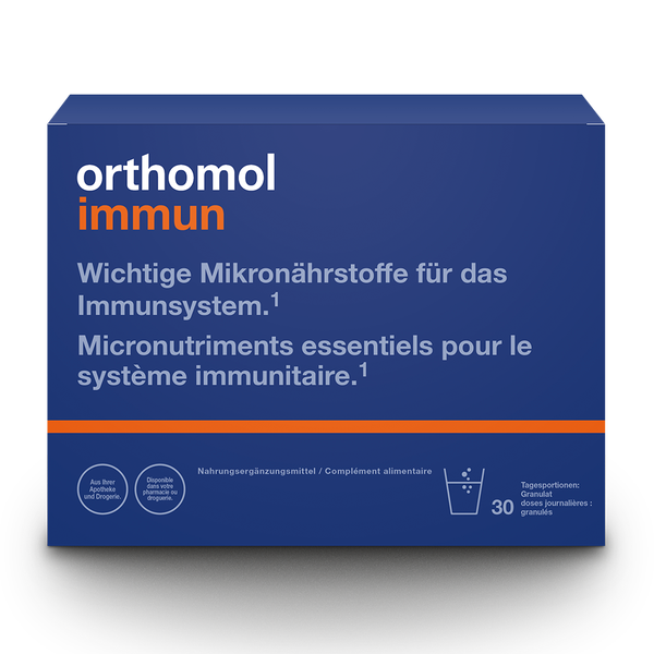 Orthomol Immun Granulat: Täglich den Inhalt eines Beutels in 150 – 200 ml stilles Wasser einrühren und zu oder nach einer Mahlzeit einnehmen.