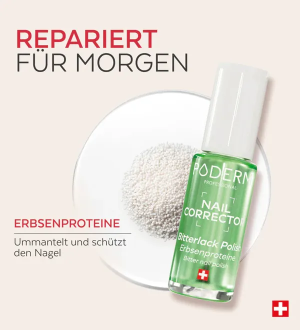 Die Nail-Corrector-Serie von PODERM® besteht aus 6 Referenzen, die entwickelt wurden, um ein natürliches Ergebnis zu erzielen und das Erscheinungsbild der Nägel im Alltag zu verbessern. Der Nagellack Nail Corrector - Bitterlack Polish Erbsenproteine kann allein als korrigierender Pflegelack verwendet werden oder eine Pflegeroutine mit den reparierenden PODERM®-Seren ergänzen, um die Nagelqualität langfristig zu unterstützen.