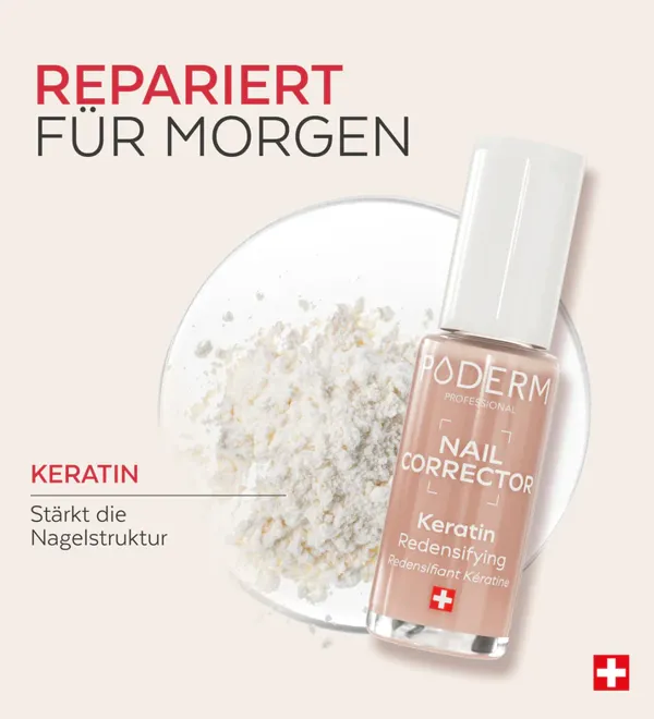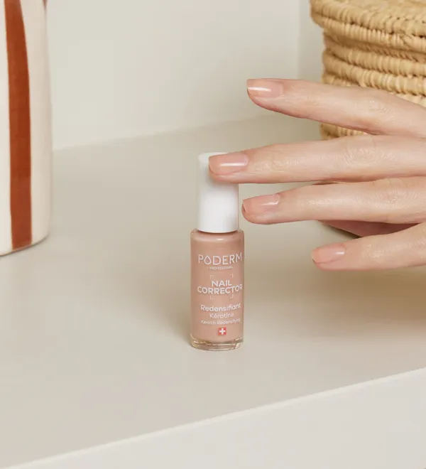 Die Nail-Corrector-Serie von PODERM® besteht aus 6 Referenzen, die entwickelt wurden, um ein natürliches Ergebnis zu erzielen und das Erscheinungsbild der Nägel im Alltag zu verbessern. Der Nagellack Nail Corrector Verdichtend mit Keratin kann allein als korrigierender Pflegelack verwendet werden oder eine Pflegeroutine mit den reparierenden PODERM®-Seren ergänzen, um die Nagelqualität langfristig zu unterstützen.