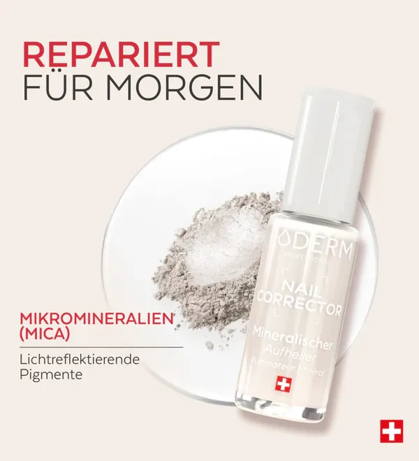 Die Nail-Corrector-Serie von PODERM® besteht aus 6 Referenzen, die entwickelt wurden, um ein natürliches Ergebnis zu erzielen und das Erscheinungsbild der Nägel im Alltag zu verbessern. Der Nagellack Nail Corrector - Mineralischer Aufheller kann allein als korrigierender Pflegelack verwendet werden oder eine Pflegeroutine mit den reparierenden PODERM®-Seren ergänzen, um die Nagelqualität langfristig zu unterstützen.