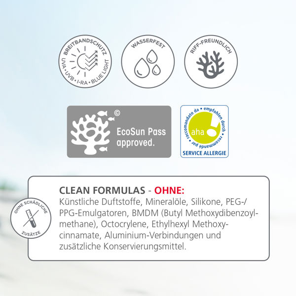 Sonnenschutz immer 15 bis 30 Minuten vor der Sonnenexposition grosszügig auftragen. Zu gering aufgetragene Mengen reduzieren die Schutzleistung markant. Auch Sonnenschutzprodukte mit hohem Lichtschutzfaktor bieten keinen vollständigen Schutz. Babys und Kleinkinder vor direkter Sonneneinstrahlung schützen und gleichzeitig schützende Kleidung sowie Sonnenschutzmittel mit hohem Lichtschutzfaktor verwenden. Intensive Mittagssonne meiden. Wiederholt auftragen, insbesondere nach intensivem Schwitzen, dem Aufenthalt im Wasser und Abtrocknen. Kontakt mit der Kleidung vermeiden – kann abfärben. Augenkontakt vermeiden.