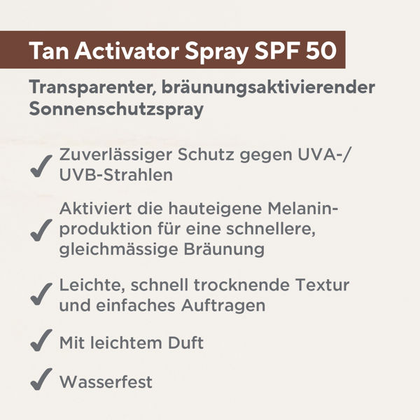 Schnell absorbierendes, nicht fettendes, nicht klebriges, transparentes UVA und UVB-Sonnenschutz-Spray (SPF50) mit Neuroglow™ zur Unterstützung und Aktivierung des natürlichen Bräunungsprozesses. Schnell und einfach sogar auf nasse Haut aufzutragen.