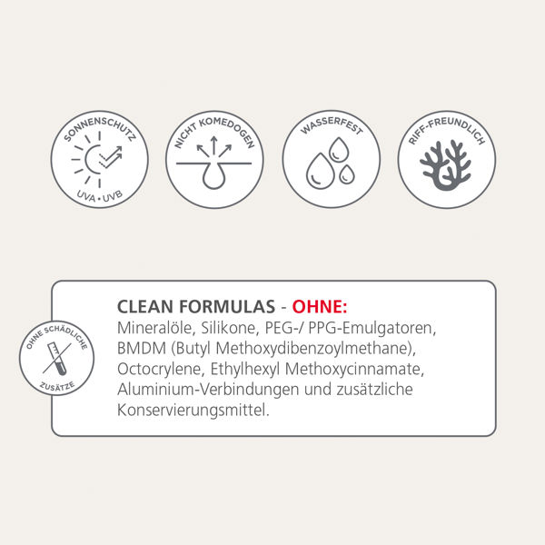 Sonnenschutz immer 15 bis 30 Minuten vor der Sonnenexposition grosszügig auftragen. Zu gering aufgetragene Mengen reduzieren die Schutzleistung markant. Auch Sonnenschutzprodukte mit hohem Lichtschutzfaktor bieten keinen vollständigen Schutz. Babys und Kleinkinder vor direkter Sonneneinstrahlung schützen und gleichzeitig schützende Kleidung sowie Sonnenschutzmittel mit hohem Lichtschutzfaktor verwenden. Intensive Mittagssonne meiden. Wiederholt auftragen, insbesondere nach intensivem Schwitzen, dem Aufenthalt im Wasser und Abtrocknen. Kontakt mit der Kleidung vermeiden – kann abfärben. Augenkontakt vermeiden. Entzündbar – enthält Alkohol.