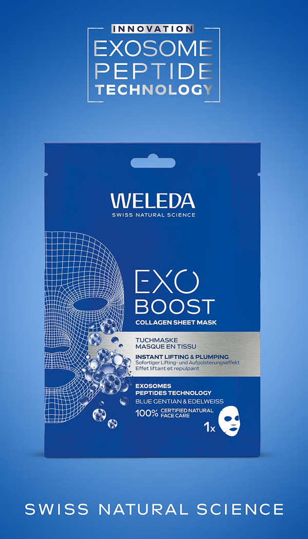 Die Tuchmaske mit Collagen+ Active Complex und der innovativen EXOSOMES PEPTIDES TECHNOLOGY sorgt für spürbar prallere Haut ab der ersten Anwendung.