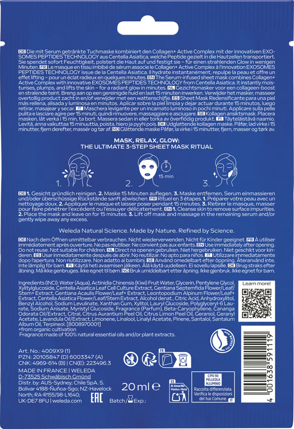 Die mit Serum getränkte Tuchmaske kombiniert den Collagen+ Active Complex mit der innovativen EXOSOMES PEPTIDES TECHNOLOGY aus Centella Asiatica, welche Peptide gezielt in die Hautzellen transportiert und für eine intensive Pflege sorgt. Die Maske spendet sofort Feuchtigkeit, polstert die Haut auf und verleiht ihr einen strahlenden Glow. Bereits nach der ersten Anwendung wirkt die Haut praller, glatter und gestrafft, während das Hautbild verfeinert erscheint und Krähenfüße sichtbar geglättet werden.