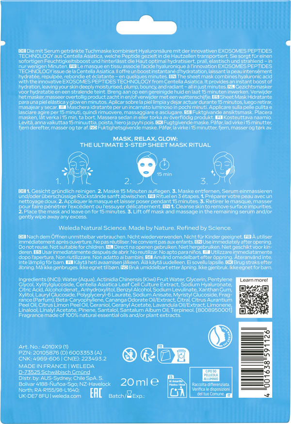 Die mit Serum getränkte Tuchmaske kombiniert Hyaluronsäure mit der innovativen EXOSOMES PEPTIDES TECHNOLOGY aus Centella Asiatica, welche Peptide gezielt in die Hautzellen transportiert. Sie sorgt für einen sofortigen Feuchtigkeitsboost und hinterlässt die Haut optimal hydratisiert, prall, elastisch und strahlend – in nur wenigen Minuten. Schenkt einen sofortigen "Dewy Glow" - einen frischen, strahlenden Teint, der die Haut gesund und hydratisiert aussehen lässt.