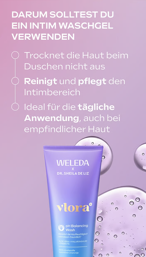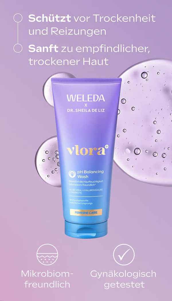 Vlora+ pH Balancing Wash ist eine gynäkologisch getestete Intimpflege, entwickelt in Zusammenarbeit mit Dr. Sheila de Liz. Die Formel reinigt sensible Haut im äusseren Intimbereich sanft und ist für die Intimrasur sowie die Anwendung während Schwangerschaft und Stillzeit geeignet.