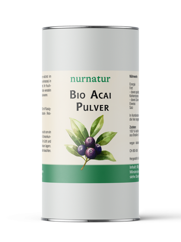Die dunkelviolette bis schwarze Acaibeere wächst im Amazonasgebiet an der Acaipalme (Euterpe oleracea) in ca. 20 m Höhe und wird von Hand geerntet. Ihr fruchtig-herber Geschmack und die intensive Farbe veredeln Smoothies, Shakes, Müslis, Desserts und Backwaren.