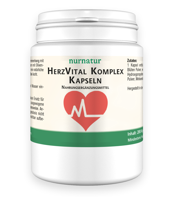 HerzVital Komplex – natürliche Pflanzenmischung aus Weissdorn, Olivenblatt & Melisse für ein starkes, ausgeglichenes Herz.
