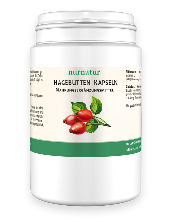 Pflanzliche Kapseln mit Hagebutte, einer seit langem geschätzten Wildfrucht. - Hergestellt in der Schweiz