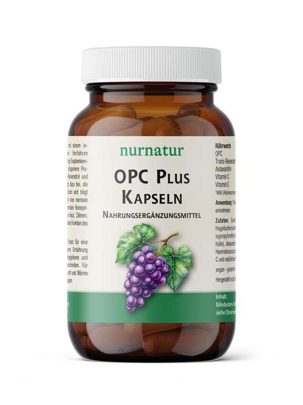 Unsere OPC Plus Kapseln werden mit einem innovativen, sauerstoffgeschützten Verfahren hergestellt und enthalten pro Kapsel 385 mg Traubenkern-Hagebuttenextrakt mit 150 mg OPC (oligomere Procyanidine) sowie Astaxanthin, Trans-Resveratrol und die Vitamine C und E. Vitamin C trägt dazu bei, die Zellen vor oxidativem Stress zu schützen und trägt zu einer normalen Kollagenbildung für eine normale Funktion der Blutgefässe, für eine normale Knorpelfunktion, für eine normale Funktion von Haut, Zähnen, Zahnfleisch, Knochen, sowie zu einer normalen Funktion des Immunsystems bei.